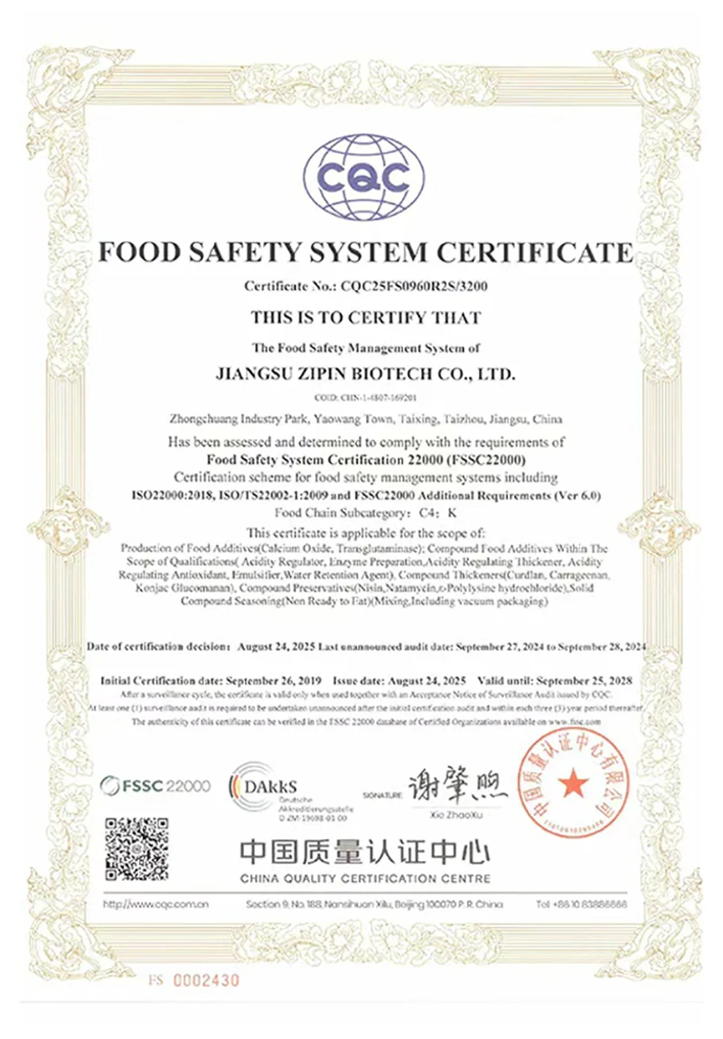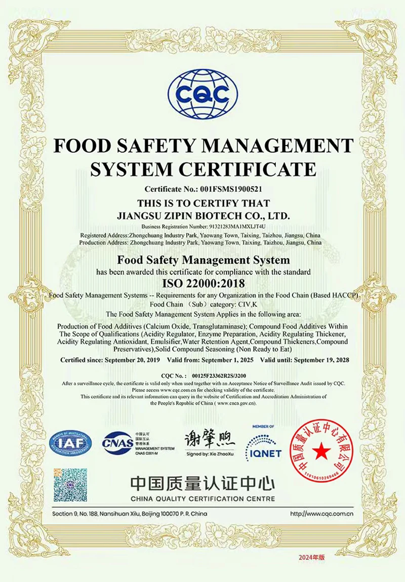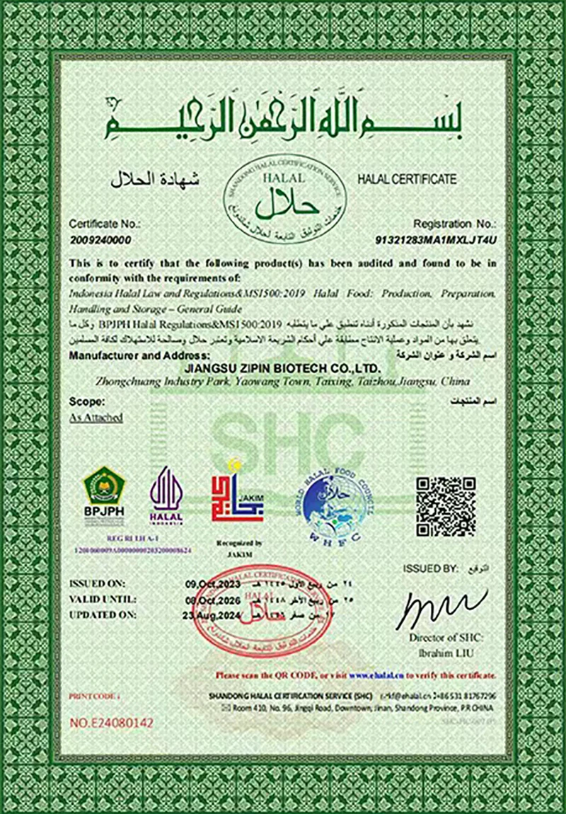 Jiangsu Zipin Biotech Co, Ltd. 2016-cı ildə qurulmuş, 20.000㎡ ərazini əhatə edən. Müasir bir xüsusi müəssisə olaraq, indi əsasən Ar-Ge, Qida Aşqarlarının istehsalı və satışı ilə məşğul olduq. Əsas məhsullarımız varTransglutaminaz, Curdlan, ε-polilylysine, Nisin, Natamycin və digər qida əlavələri.