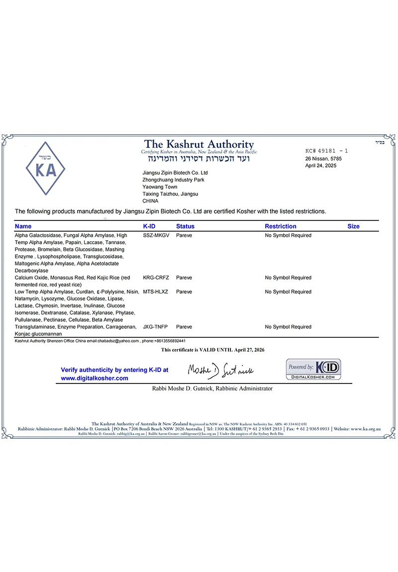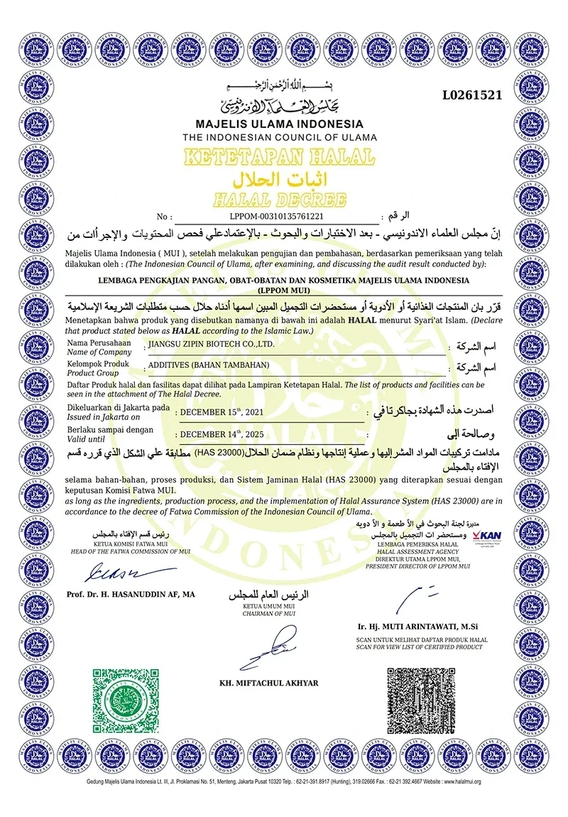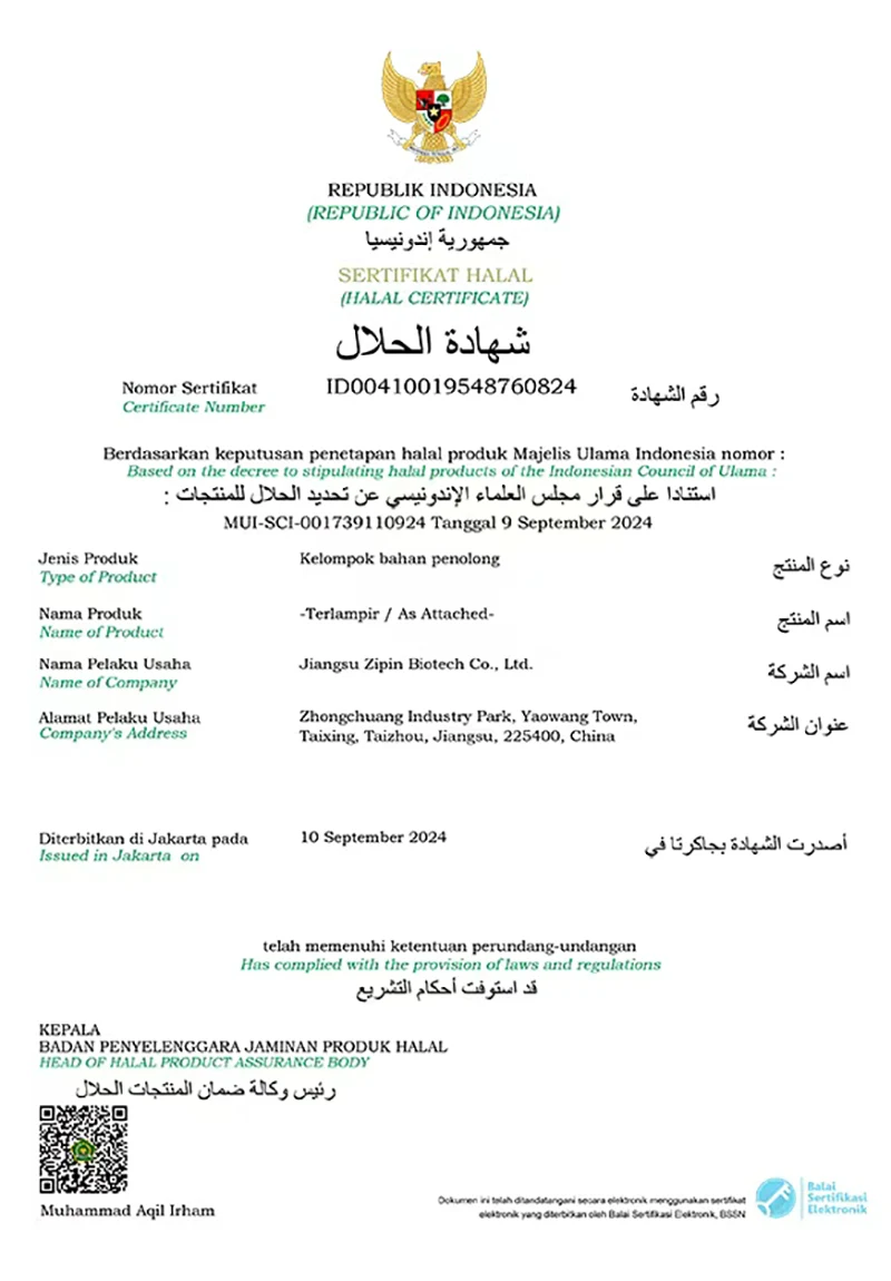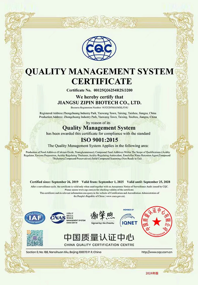Jiangsu Zipin Biotech Co, Ltd. 2016-cı ildə qurulmuş, 20.000㎡ ərazini əhatə edən. Müasir bir xüsusi müəssisə olaraq, indi əsasən Ar-Ge, Qida Aşqarlarının istehsalı və satışı ilə məşğul olduq. Əsas məhsullarımız varTransglutaminaz, Curdlan, ε-polilylysine, Nisin, Natamycin və digər qida əlavələri.